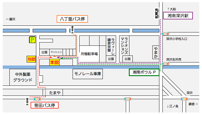 湘南モノレール江の島線・湘南深沢駅を出て、南西へ徒歩約6分。